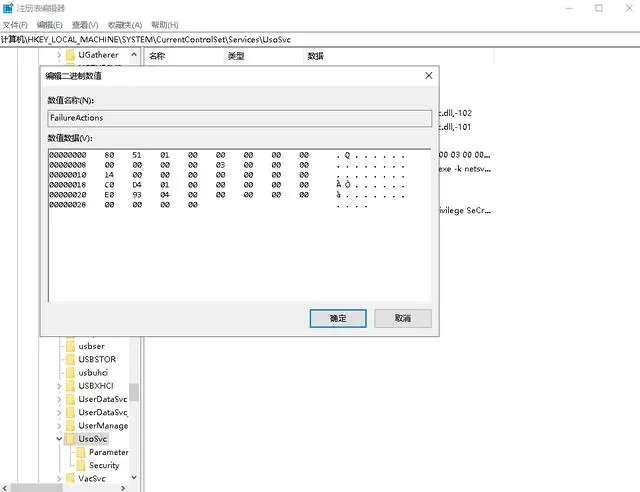 4、继续在右侧找到“FailureActions”键,右键点击修改该键的二进制数据,将“0010”、“0018”行的左起第5个数值由原来的“01”改为“00”,完成后,点击下方的“确定”即可。