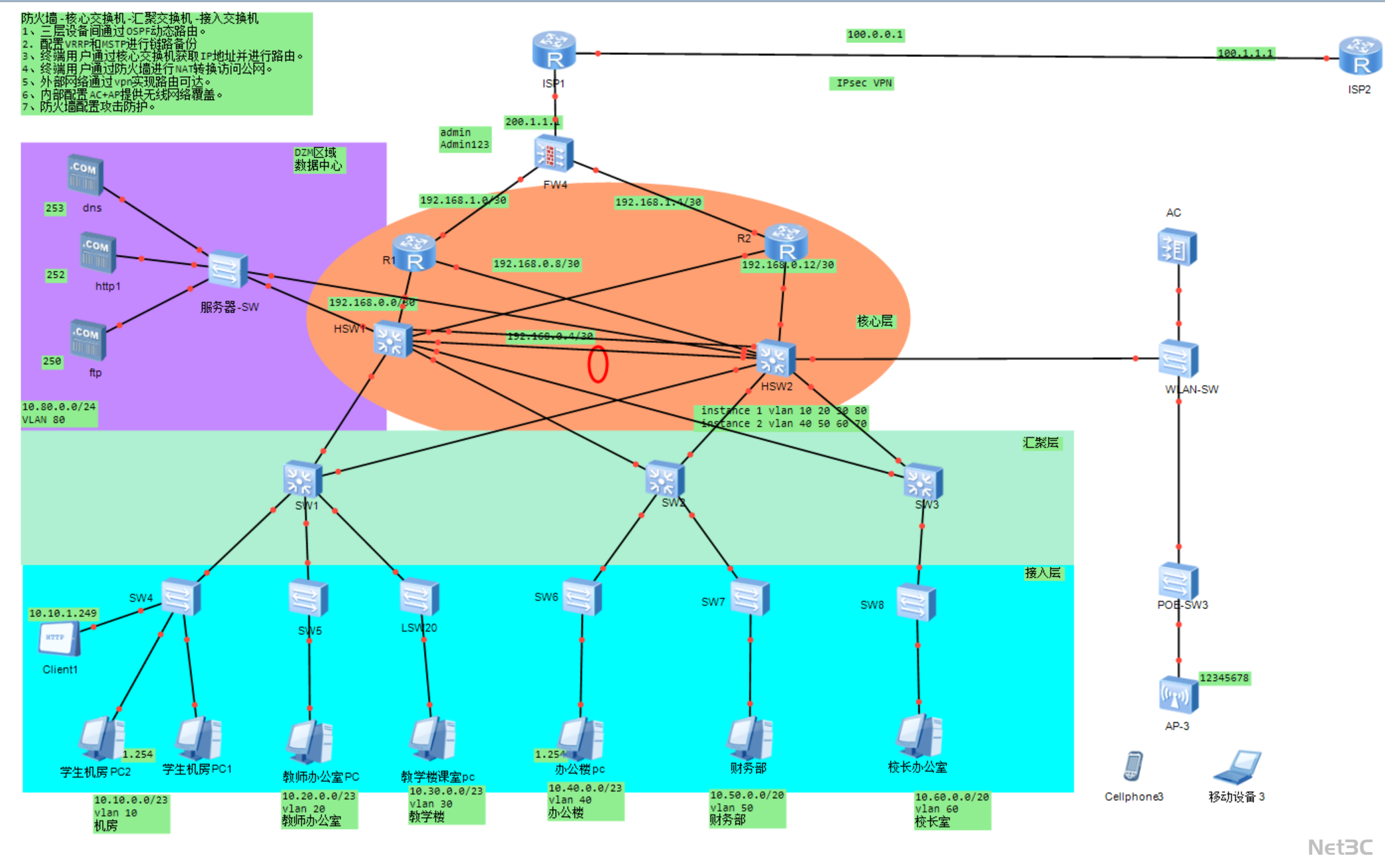 网络分层架构:采用核心层(HSW1、HSW2)、汇聚层(SW1-3)、接入层(SW4-8 等)的分层设计,实现校园不同区域(学生机房、教师办公室、财务部等)终端设备的接入与网络流量管理。