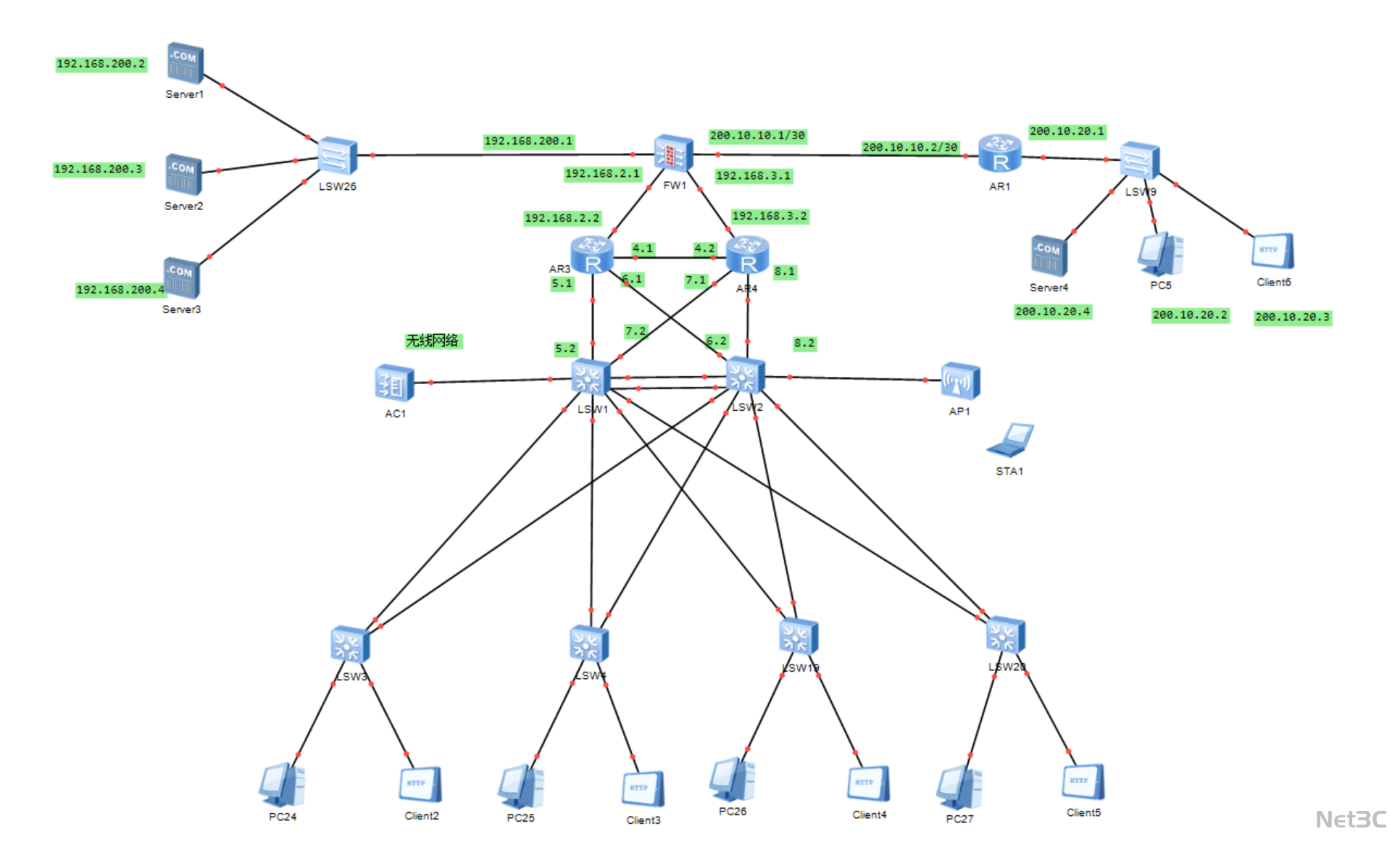 网络安全与互联:防火墙(FW1)部署在网络关键节点,过滤流量;路由器(AR1、AR3、AR4)实现不同网络区域(如 192.168.200.0/24、200.10.28.0/24 网段)的互联,保障内外网通信。