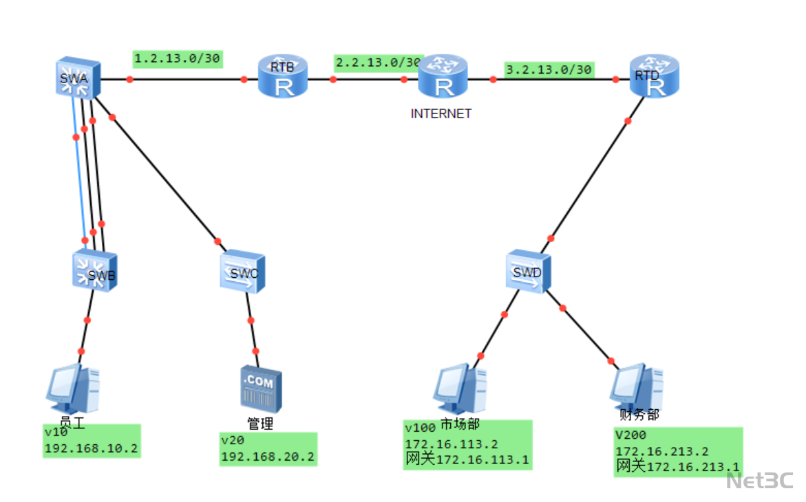 公网互联链路:通过三段 30 位掩码的公网地址(1.2.13.0/30、2.2.13.0/30、3.2.13.0/30)将总部核心交换机与 RTB、核心路由器、RTD 串联,构建稳定的广域网传输通道。