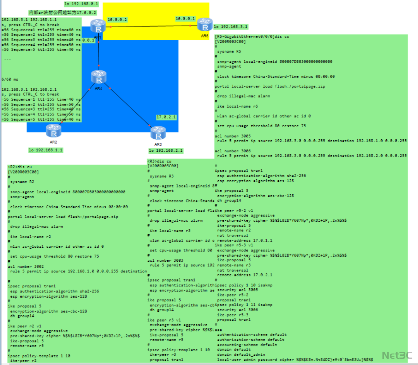 互联链路:公网地址为 172.0.0.0/24,各分支通过 IPSec VPN 隧道与总部加密通信。