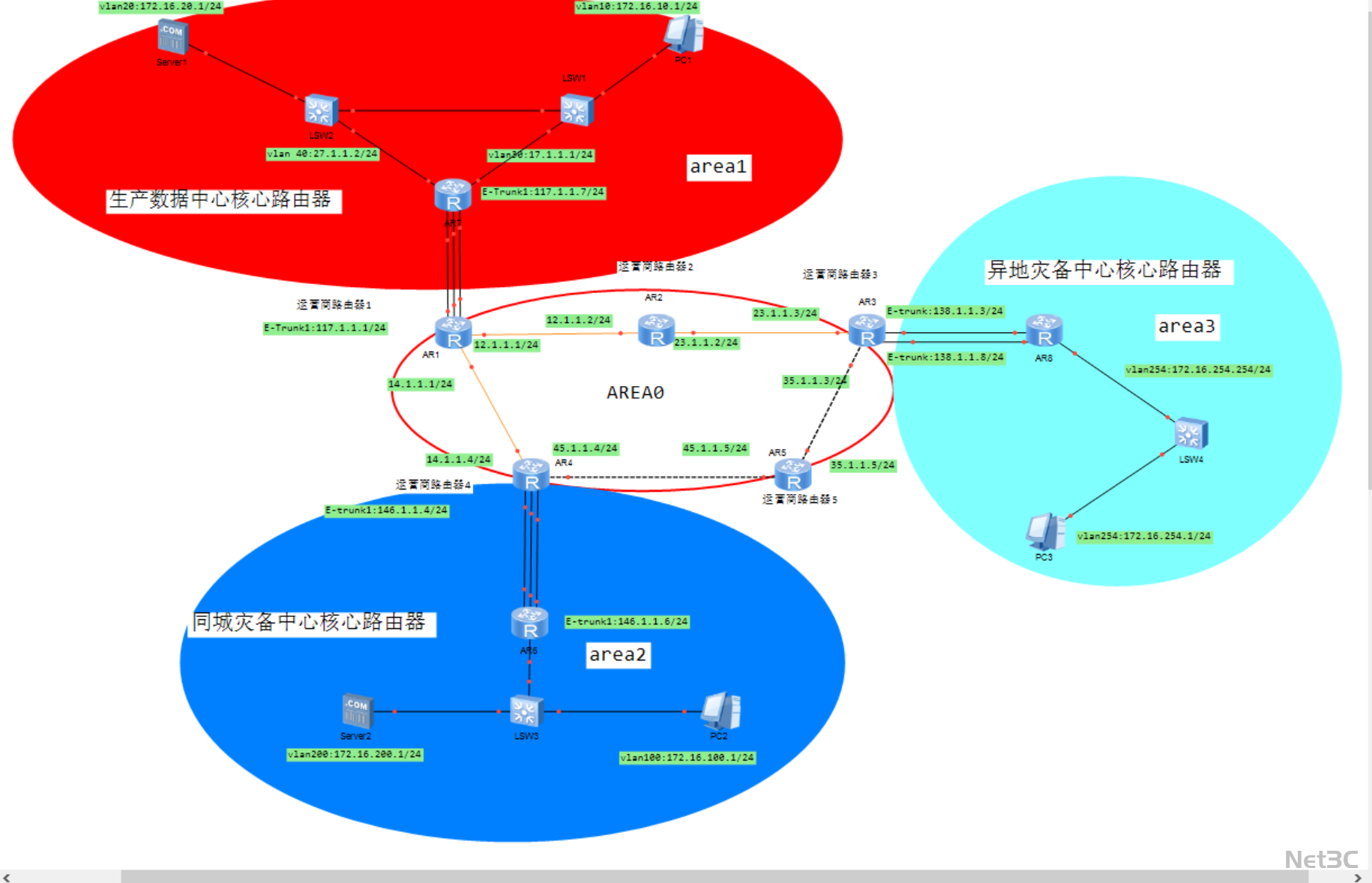 异地灾备中心(area3,青色区域):部署异地灾备核心路由器与接入交换机(LSW4),承载终端 PC3,通过跨地域链路接入骨干区域,提供极端故障下的业务容灾能力。