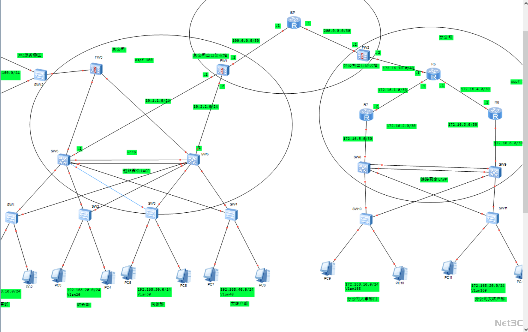 总部与分公司通过运营商 ISP 网络互联,采用 OSPF 动态路由协议实现跨园区路由自动学习,保障网络扩展性。