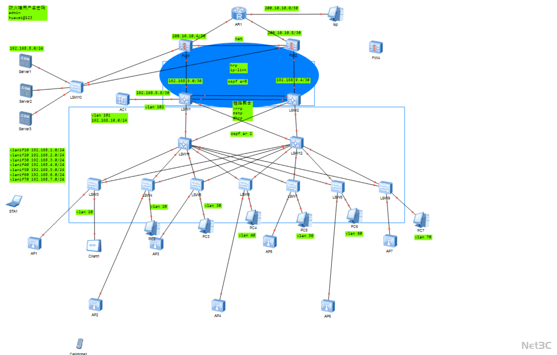 接入交换机(LSW3-LSW9)承载 PC 终端、无线 AP 与 Client 设备,划分多 VLAN(VLAN10-70)实现部门网段隔离。