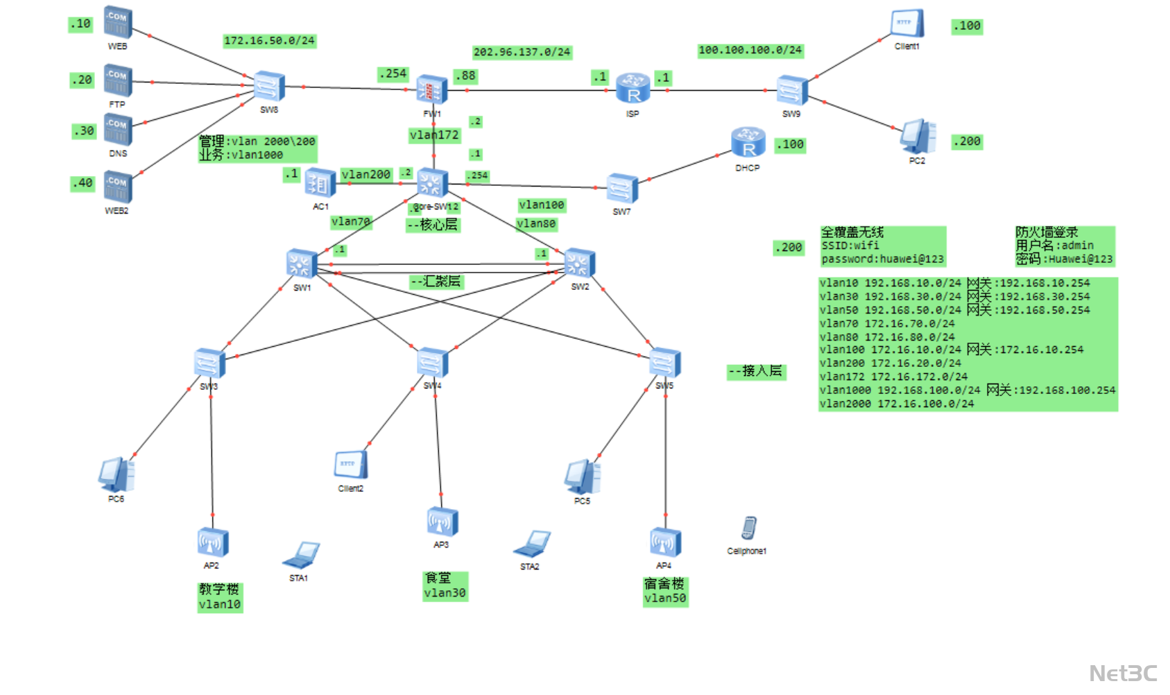 接入层:部署 SW3-SW5 接入交换机,连接教学楼(PC6、AP2)、食堂(Client2、AP3)、宿舍楼(PC5、AP4)等终端与无线 AP,通过精细化 VLAN 划分实现不同场景的网段隔离。