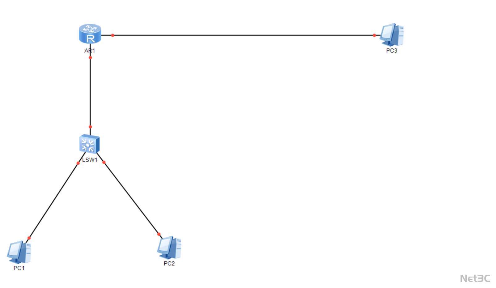 出口层:路由器 AR1 作为网络核心,承担内网与外网(PC3)的路由转发,是整个网络的互联枢纽。
