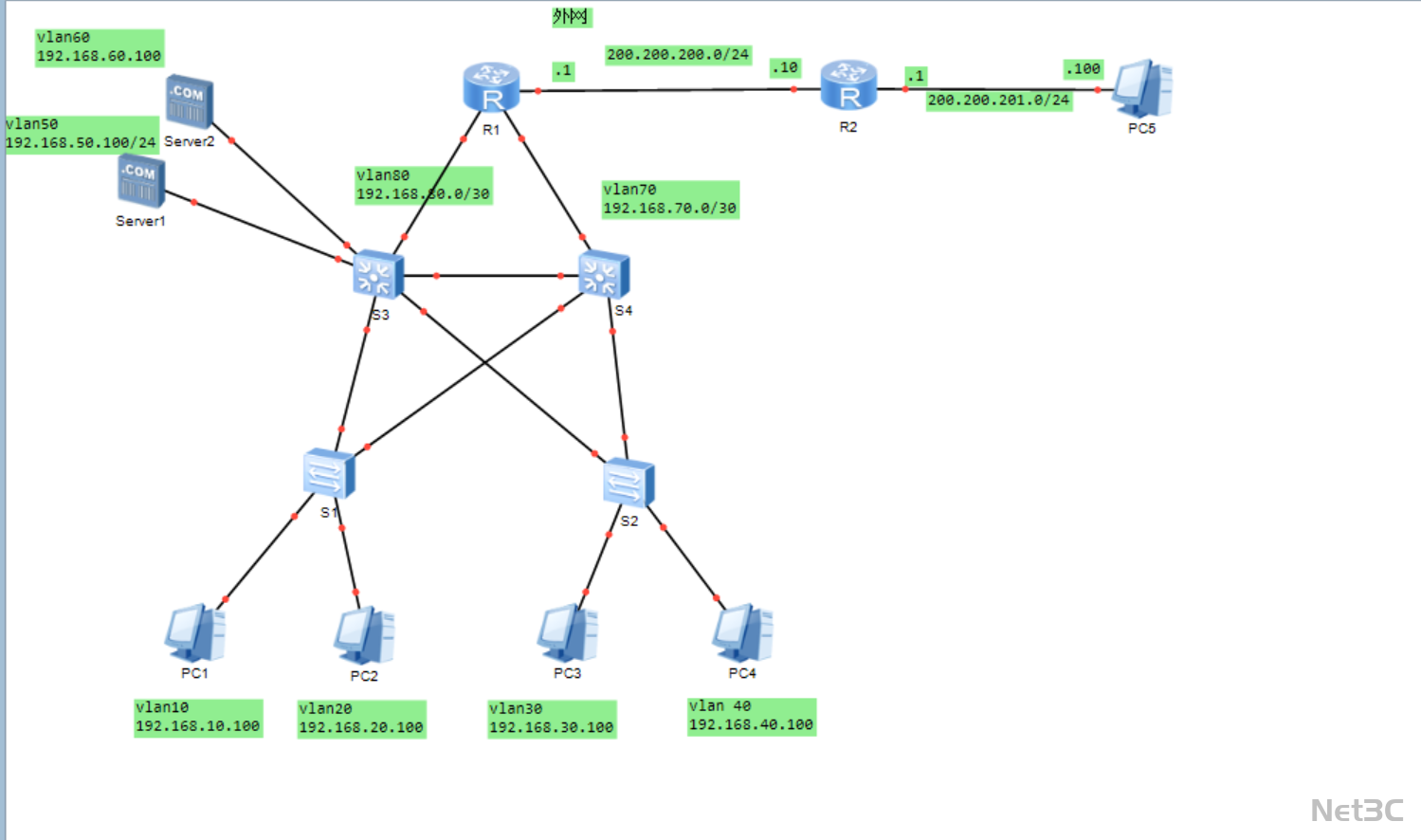 出口层:路由器 R1 作为内网核心出口,通过 200.200.200.0/24 网段连接公网路由器 R2,承载内网与公网(PC5)的流量转发。