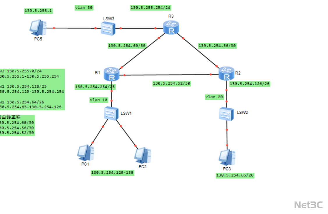 130.5.254.128/25,支持 100 台终端接入。交换机 LSW2(VLAN 20):承载 PC3 终端,分配子网
