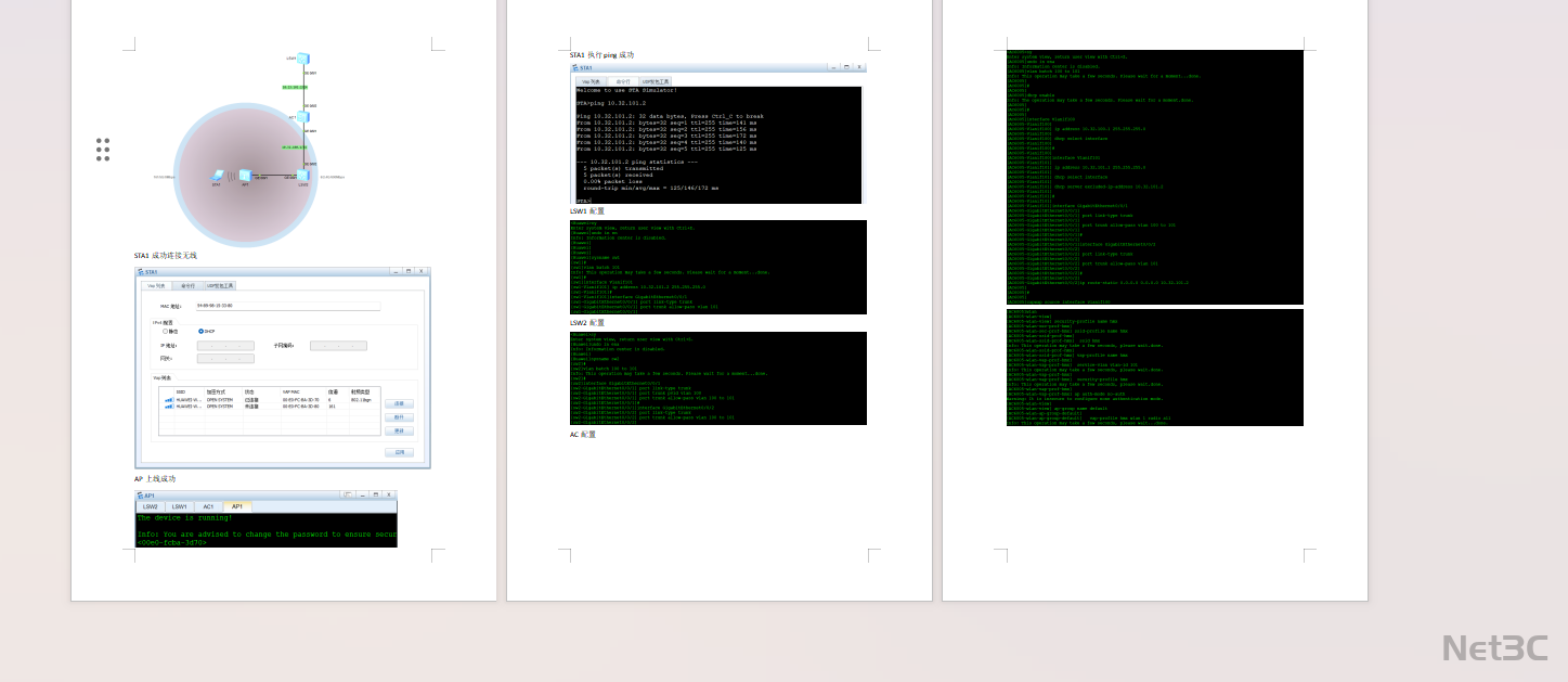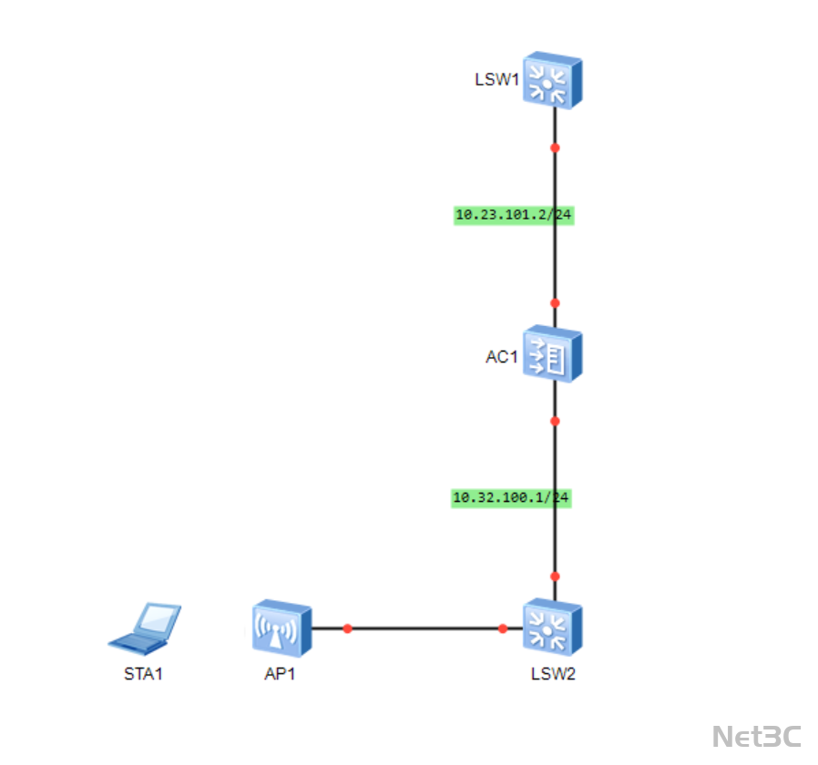 10.32.100.1/24链路连接接入交换机 LSW2,统一管理 AP1 的配置、接入认证与流量监控。接入层:接入交换机 LSW2 连接 AP1,为无线终端 STA1 提供接入服务,通过 VLAN 划分实现无线流量与其他业务的隔离。