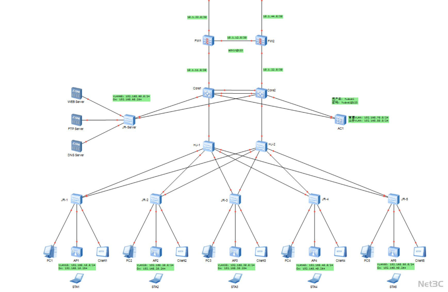 AC 控制器统一管理全企业 AP,实现无线办公全覆盖;服务器区(WEB/FTP/DNS)通过独立 VLAN 接入核心层,保障业务系统的高可用。