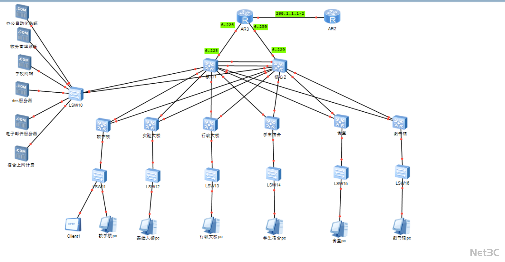 办公自动化、教务管理、学校网站等 6 台核心业务服务器,通过交换机 LSW10 接入核心层,划分专属 VLAN 保障业务系统的高可用与安全性。