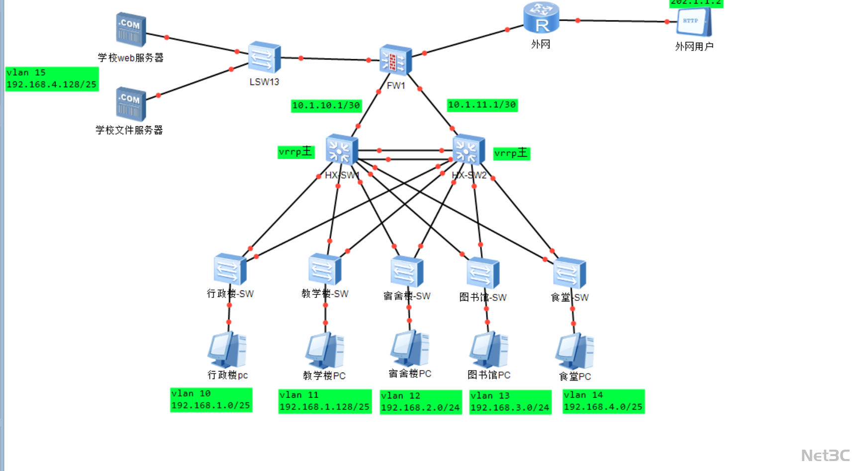 学校 WEB 服务器、文件服务器部署在专属 VLAN15(192.168.4.128/25),通过独立交换机(LSW13)接入核心层,保障教学业务系统 7×24 小时稳定运行。