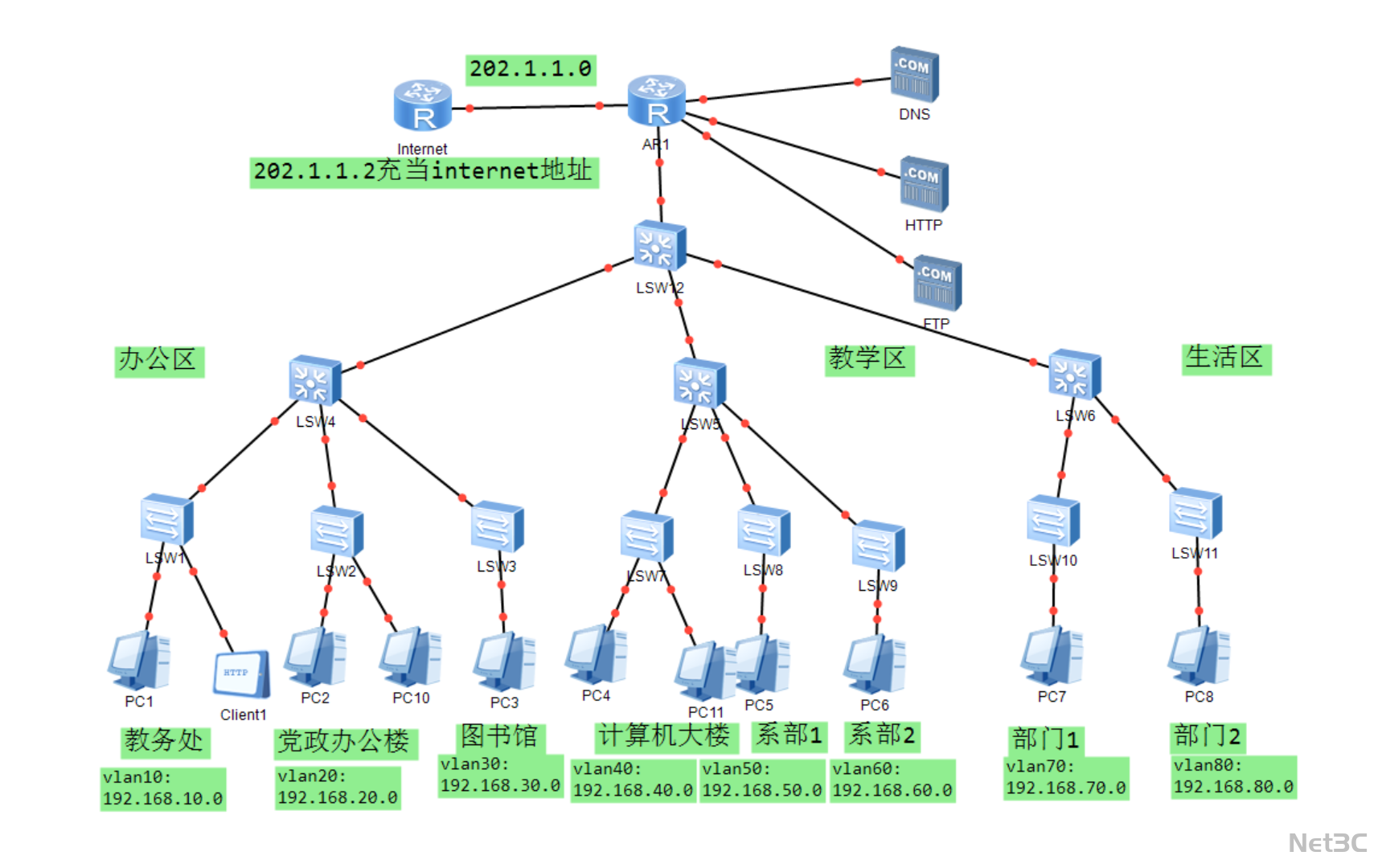 为教务处、计算机大楼等部门划分专属 VLAN,避免跨区域流量干扰,保障教学数据安全,符合高校网络管理规范。