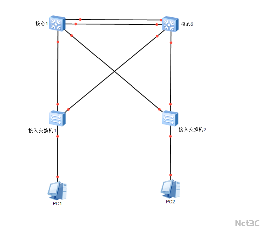 PC1、PC2 等终端通过接入交换机接入网络,享受双核心冗余带来的高可用保障,确保办公业务不中断。