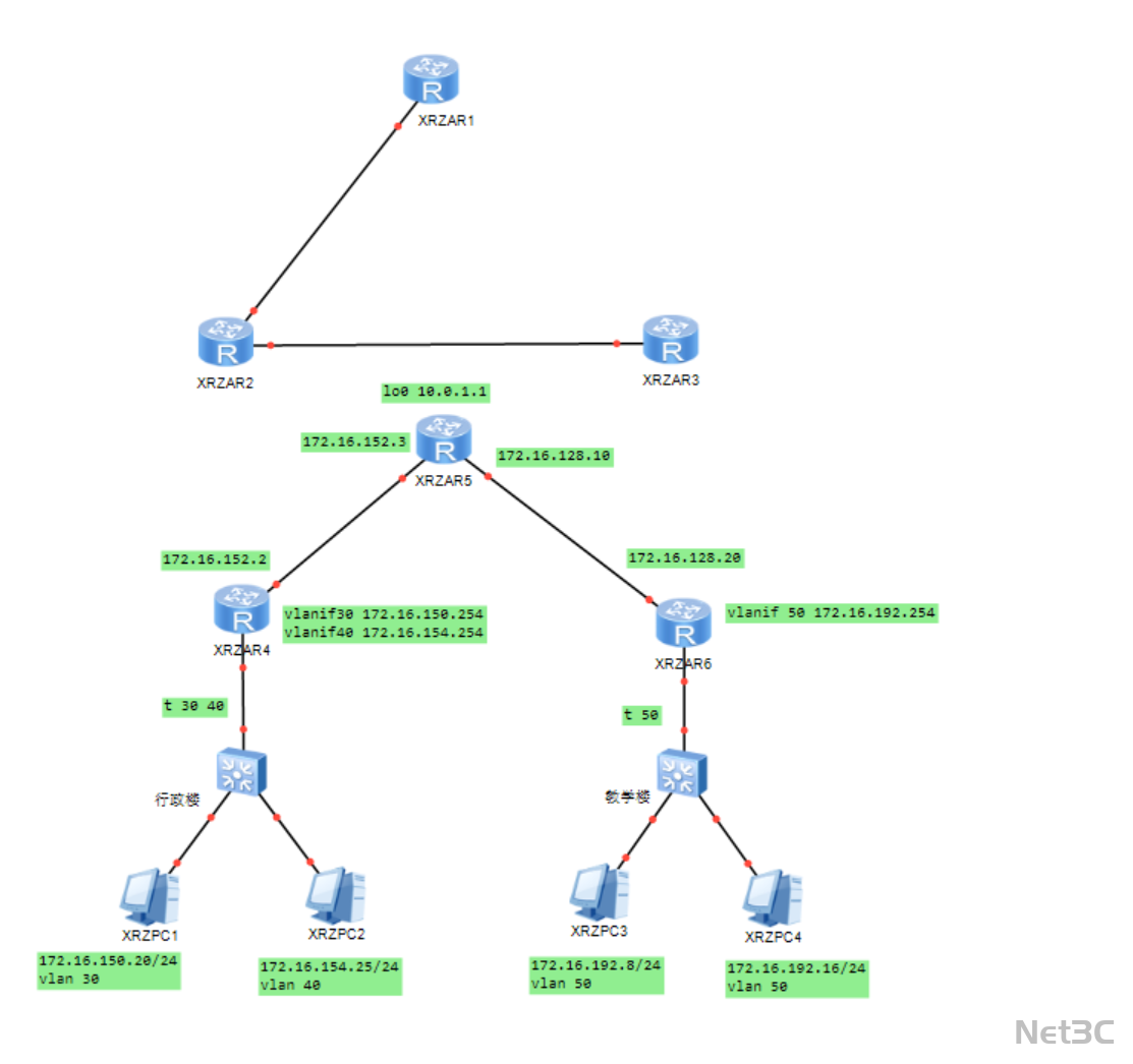 行政楼与教学楼的接入路由器(XRZAR4、XRZAR6)分别连接楼宇交换机,划分 VLAN30、40、50 实现部门网段隔离,保障不同楼宇的数据安全。